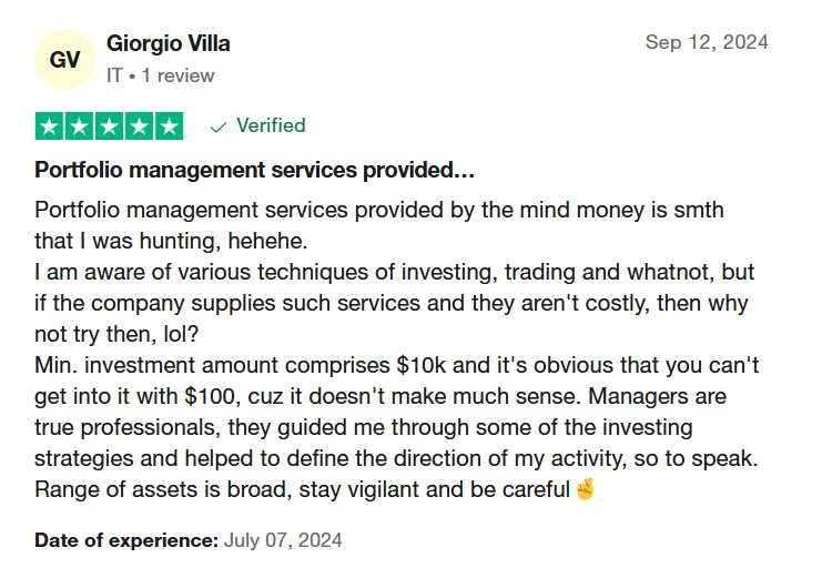 «Mind-Money.eu отлично подходит для долгосрочных инвестиций. Я торгую акциями и облигациями, интерфейс прост и интуитивно понятен. Верификация прошла без проблем, хотя немного задержалась.»
